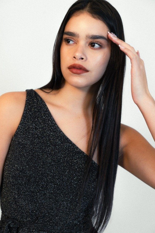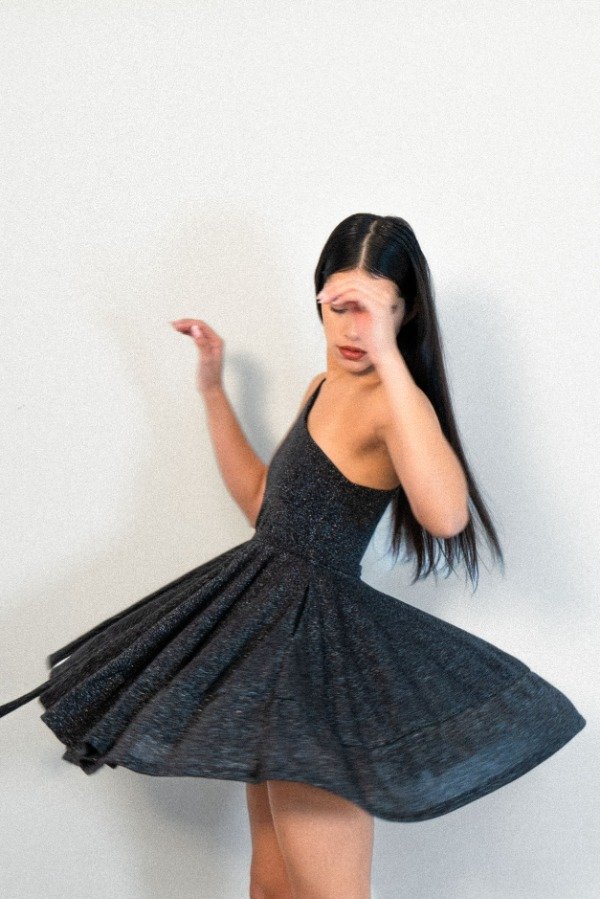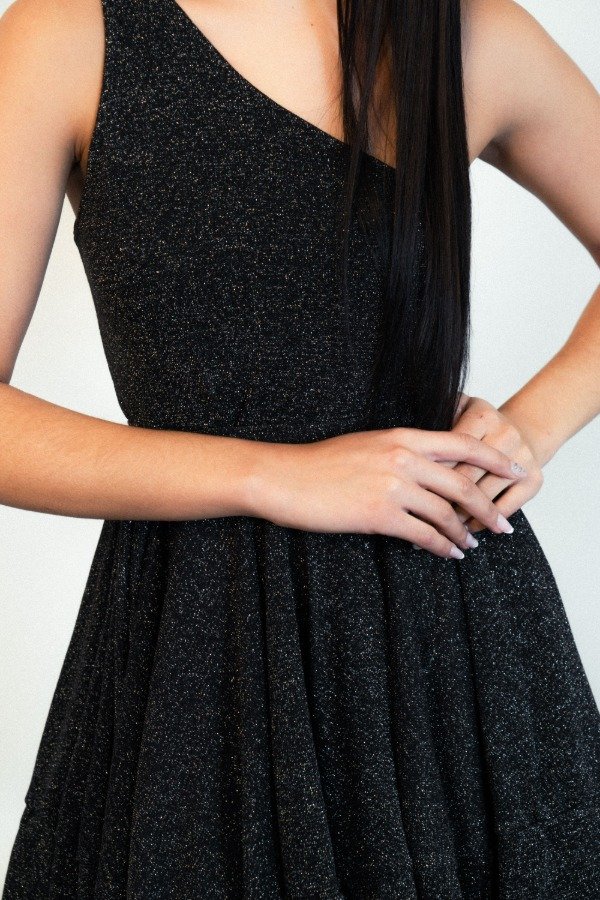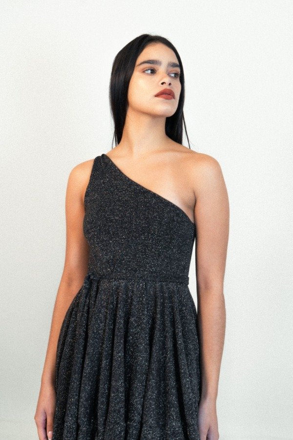 El vestido está confeccionado en tejido con lúrex plateado, que aporta un brillo sutil y elegante al movimiento. Su diseño de un solo hombro marca un escote asimétrico que realza la silueta de manera delicada, mientras que la falda amplia con vuelo genera una caída fluida y femenina.